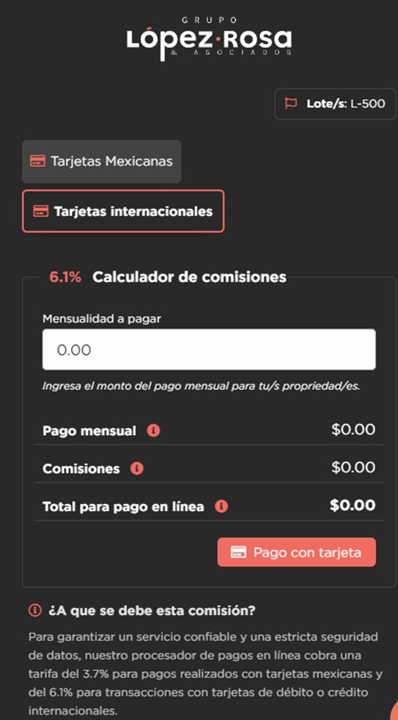 a. Pagos: A través del portal, podrá realizar pagos relacionados con sus inversiones en López Rosa. Usted es responsable de asegurarse de que los pagos se realicen de manera oportuna y precisa. López Rosa no se hace responsable de los errores u omisiones en los pagos realizados a través del portal.