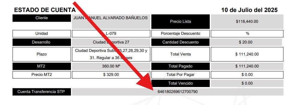 En este espacio se indica la cuenta STP única designada al lote para realizar los pagos: